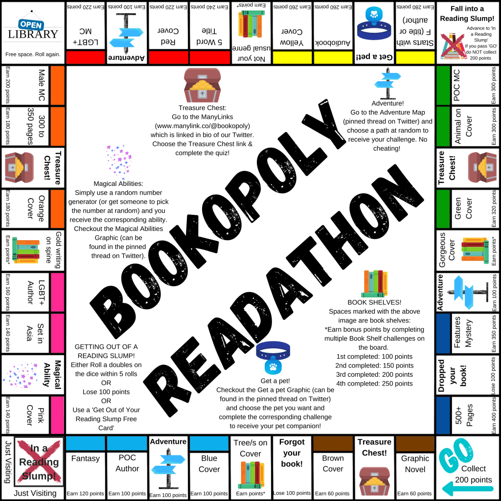 For this ReadAThon all you have to do is roll 2 dice and make your way around the board earning or losing points based on the spaces you land on and what is required for each space. Pretty simple but I have added some fun elements like quizzes & bonus challenges throughout!