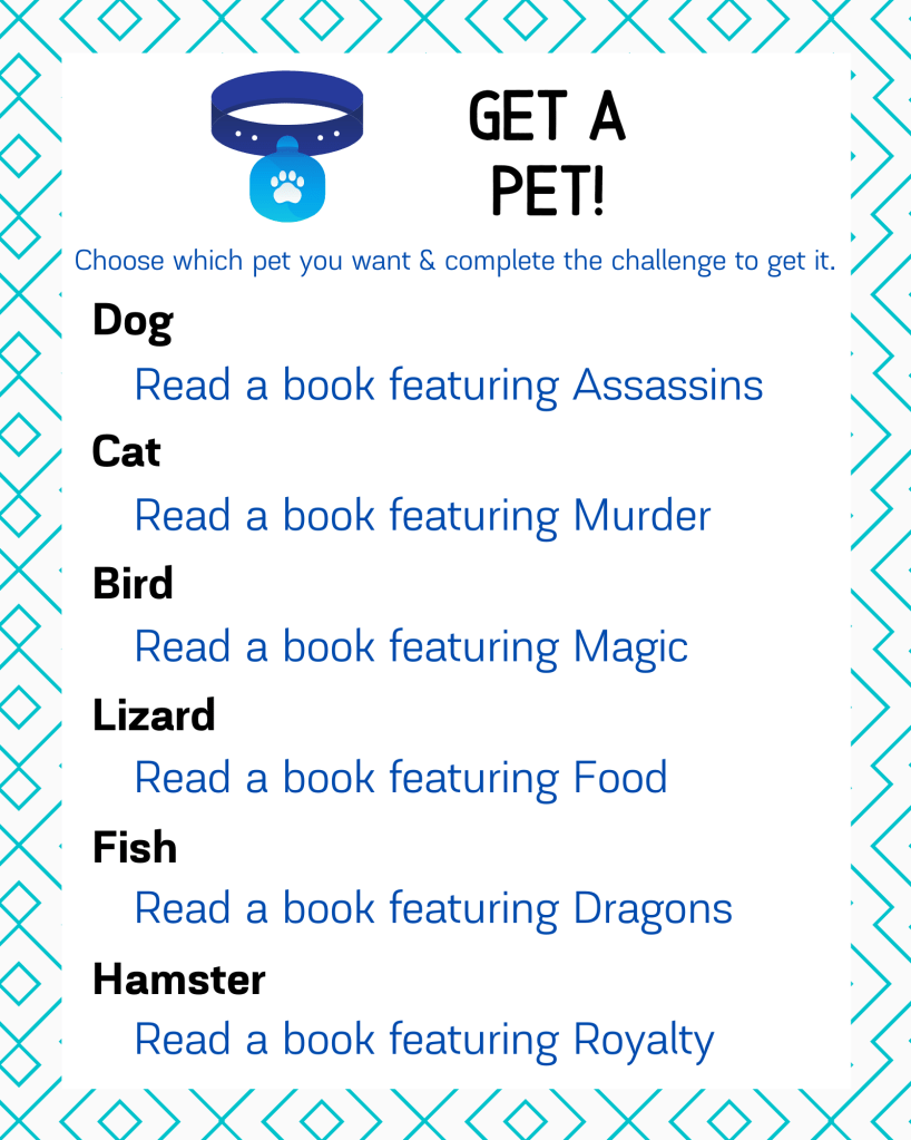 The Get a Pet space replaced the Reaping space from Round 1. In Round 2 to receive a pet companion to go on your Bookopoly ReadAThon journey you will need to check out the Get a Pet Graphic, choose your type of pet & complete the corresponding challenge.