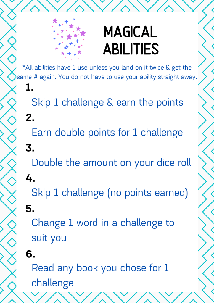 Introducing the Magical Ability space! This replaces the Sorting Hat space for Round 1. For the Magical Ability space you will need to use a random number generator or get a person to chose a number at random for you between 1 & 6. You will then receive the corresponding magical ability. You can only use this ability once for each time you land on the space. You do not need to use the ability straight away. It is completely up to you when you use the ability and on which space.