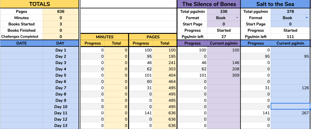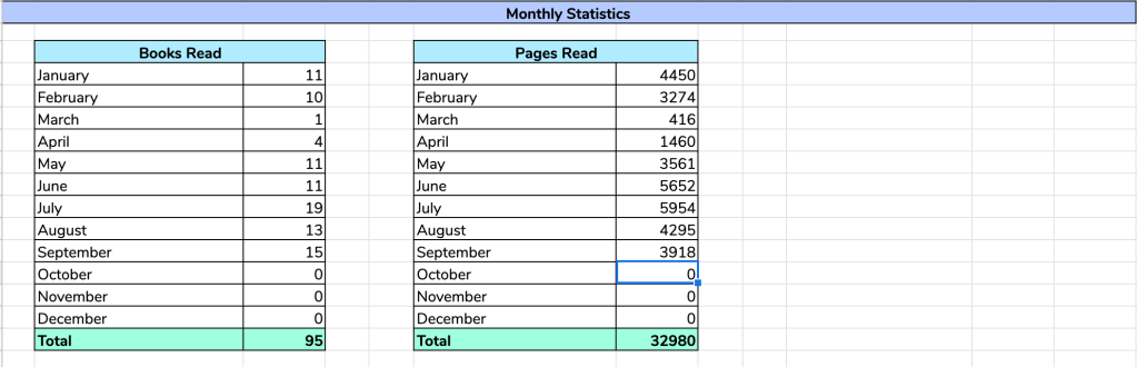 I have a monthly reading tracker spread sheet that tracks what pages exactly I’ve read of each book (this helps with my Bullet Journal & ReadAThon tracking a lot). This one I adapted a little bit from the ReadAThon Tracker that Caz @ Little Book Owl created.