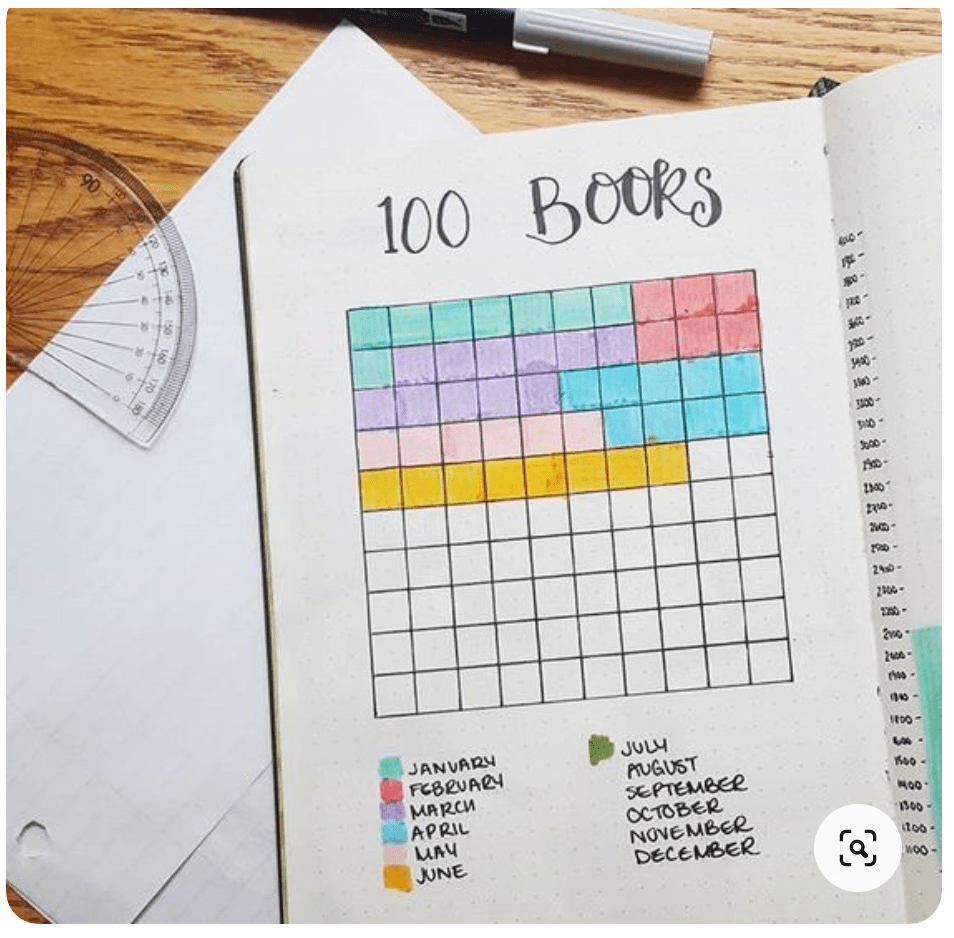 I couldn’t find a better image to show what I meant with this spread. But I want to track my 150 books a year challenge so I want to do it like the above where there is a different colour for each month.