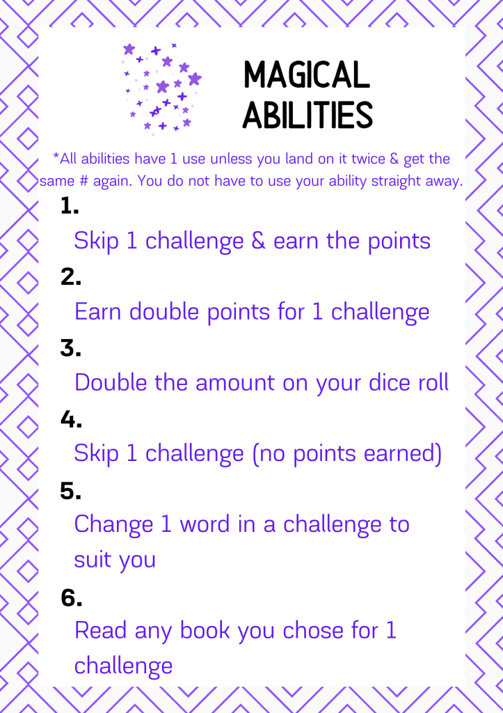 Introducing the Magical Ability space! This replaces the Sorting Hat space for Round 1. For the Magical Ability space you will need to use a random number generator or get a person to chose a number at random for you between 1 & 6. You will then receive the corresponding magical ability. You can only use this ability once for each time you land on the space. You do not need to use the ability straight away. It is completely up to you when you use your ability and on which space.