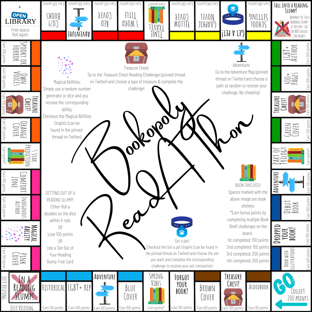For this ReadAThon all you have to do is roll 2 dice and make your way around the board earning or losing points based on the spaces you land on and what is required for each space. Pretty simple but I have added some fun elements & bonus challenges throughout!