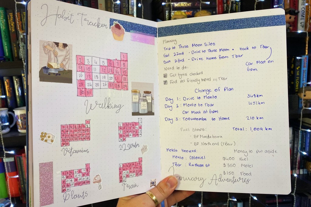 For January I chose a Baking theme & mostly used stickers from Mum & Me Handmade Designs Baking Weekly Kit as well as washi Tape from Kmart to decorate the pages. I chose to do a pretty basic drawing of a pie in the top left to fill some empty space but I prefer to use stickers in my spreads over drawing as I’m more of a Digital Artist thanks to being so indecisive. π Also the fonts I used as inspiration can both be found on Canva and they are called Andasia & Emitha.