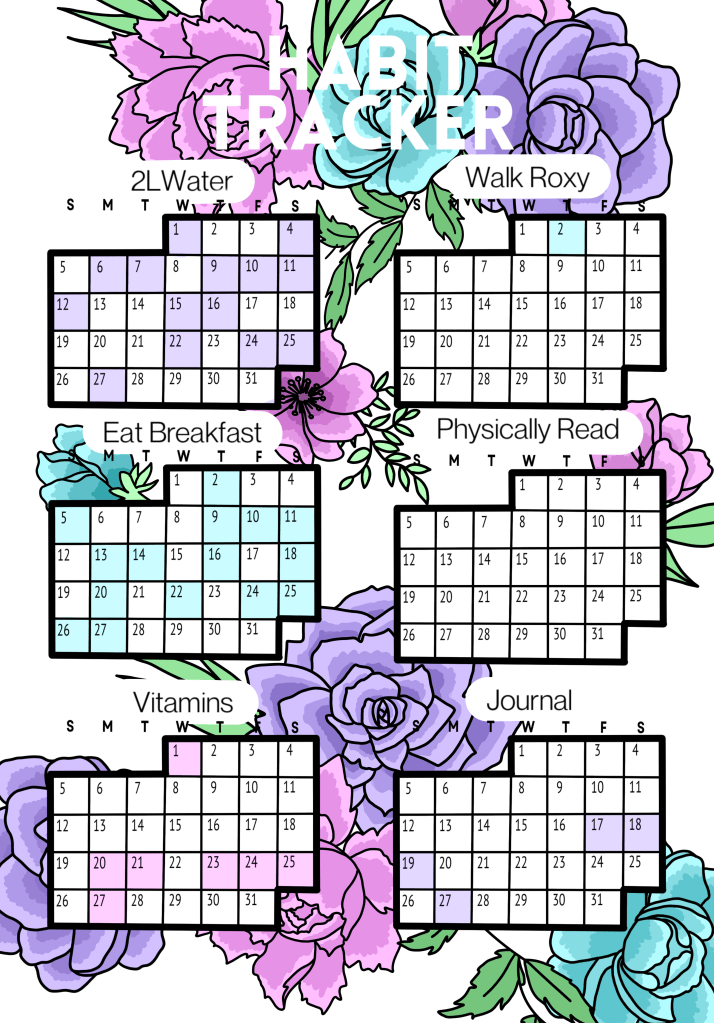 For March, it was when my mental health was declining, so I didn’t end up doing this till part way through the month. I scrolled Pinterest until I found some inspiration and I wish I had screen captured that so I could share/credit but I wasn’t thinking about that at the time. I ended up tracing the outline of the flowers, which yes, you can do as long as you’re not planning on selling your work. I honestly did not have it in me to draw anything from scratch but I wanted some semblance of normal by having my journal to do everyday.