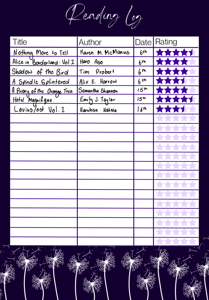 You may notice that I also scrapped the TBR spread for this month and for April & May actually. I wasn’t reading a heap, as you can see by my Reading Log that I accidentally called TBR and still haven’t fixed… Yes I know it’s a digital bullet journal and would take 30 seconds to fix but I just haven’t haha.