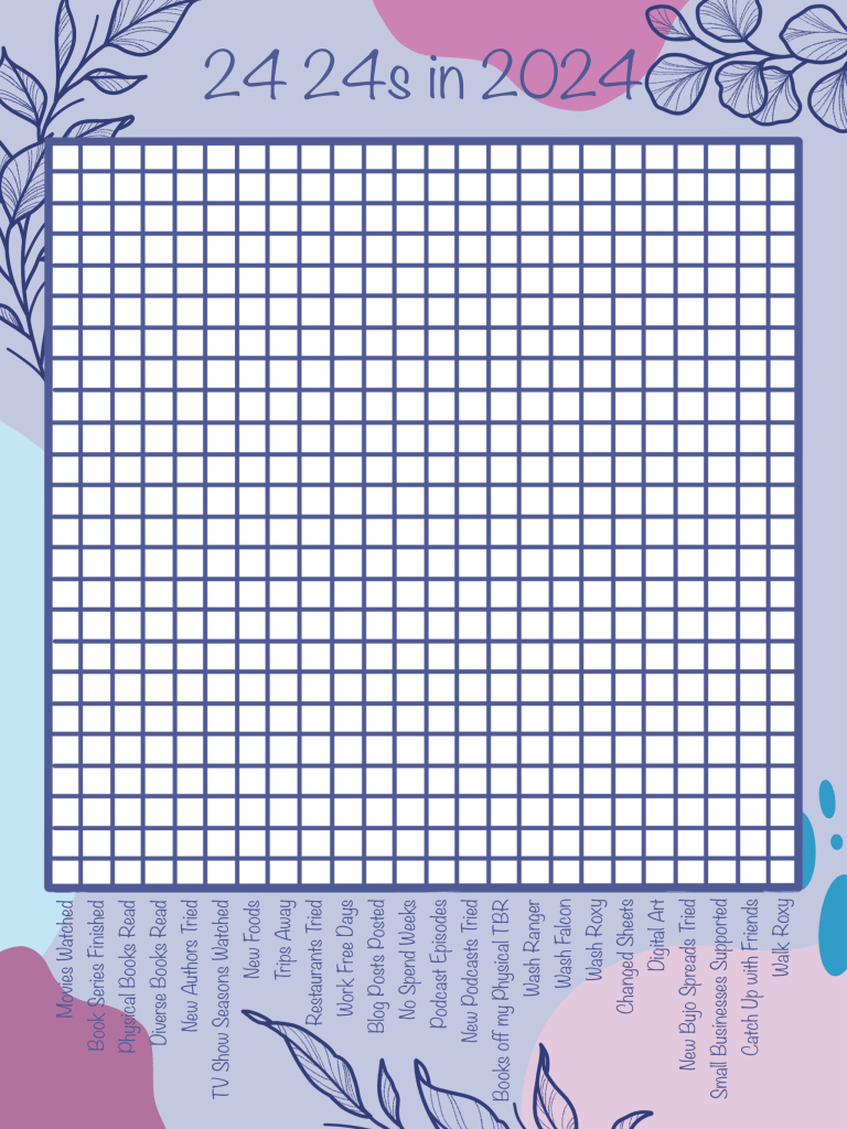 Next I have my 24 24s in 2024 which is an idea I got from JashiiCorrin on YouTube and this is my second year doing this challenge. Basically you include 24 things you want to do 24 times in 2024. These can be common things that you’ll probably do anyway or things you just want to challenge yourself to do a bit more.