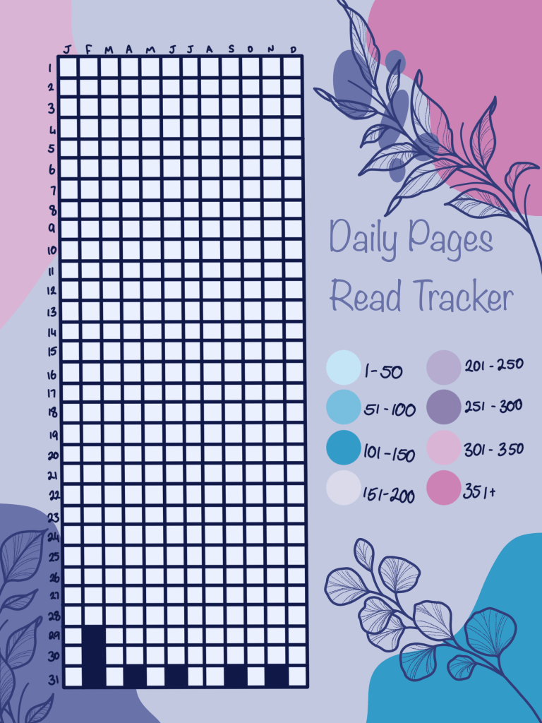 Then we have my Daily Pages Read Tracker where I record how many pages I read each day of the year. If I didn’t read anything that day I’ll simply colour it in grey as well, though I don’t have that on the key specifically.