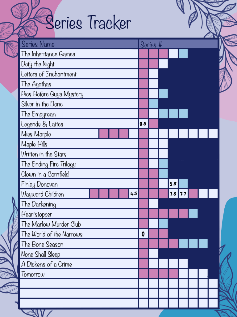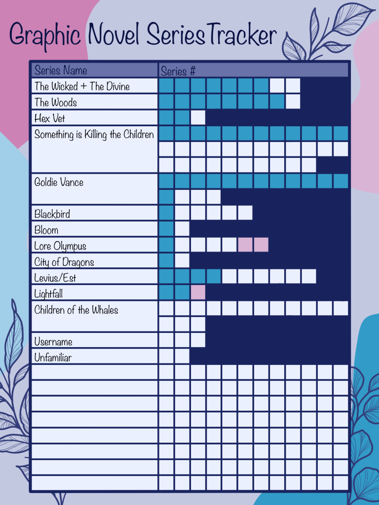 Lastly we have my two series trackers. One for Graphic Novesl and one for Novels. This is just to keep track of what I’m up to and especially because one of my goals is to finish series or at least catch up on series up to what’s released. On the Series Tracker pink indicates that I’ve read it previously to 2024 & blue is for not release yet. Some of these are releasing in 2024 though so I’ll just erase that as they release. I will also use a different colour to indicate when I read a book this year. Same for the Graphic Nove one just the colours are switched so it was a bit easier to tell them apart when going into them.